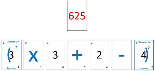 Must use all 6 Integer cards and all 5 Operator cards to produce an equation equal to the Solution card. Wild operator card may be used for any of the 4 operations. Two sets of Parentheses, a second order (2) Exponent, a third order Exponent (3) and a Factorial card are optional. May use the Exponent and Factorial cards as many times as necessary.